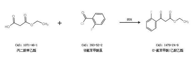2.通过丙二酸单乙酯和邻氟苯甲酰氯合成(2-氟苯甲酰)乙酸乙酯,收率约85%;