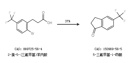 1.通过2-溴-5-(三氟甲基)苯丙酸合成5-三氟甲基-1-茚酮,收率约37%;