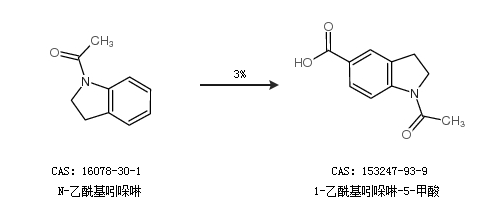 1.通过N-乙酰基吲哚啉合成1-乙酰基吲哚啉-5-甲酸,收率约3%;