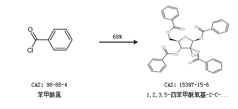 2.通过苯甲酰氯合成1,2,3,5-四苯甲酰氧基-2-C-甲基-beta-D-呋喃核糖,收率约69%;