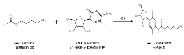 2.通过氯甲酸正戊酯和5’-脱氧-5-氟胞嘧啶核苷合成卡培他滨,收率约80%;