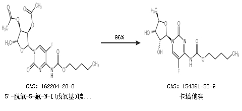 1.通过5''-脱氧-5-氟-N-[(戊氧基)羰基]胞苷 2'',3''-二乙酸酯合成卡培他滨,收率约96%;