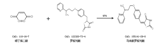 1.通过顺丁烯二酸和罗格列酮合成马来酸罗格列酮,收率约97%;