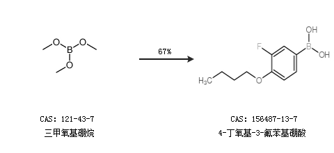 1.通过三甲氧基硼烷合成4-丁氧基-3-氟苯基硼酸,收率约67%;