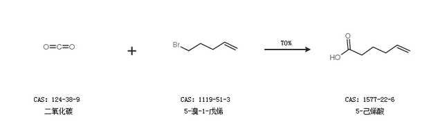 2.通过二氧化碳和5-溴-1-戊烯合成5-己烯酸,收率约70%;