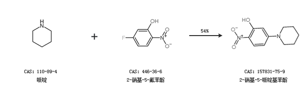 1.通过哌啶和2-硝基-5-氟苯酚合成2-硝基-5-哌啶基苯酚,收率约54%;