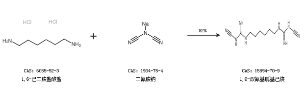 1.通过1,6-己二胺盐酸盐和二氰胺钠合成1,6-双氰基胍基己烷,收率约82%;