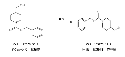 1.通过N-Cbz-4-羟甲基哌啶合成4-(溴甲基)哌啶甲酸苄酯,收率约88%;
