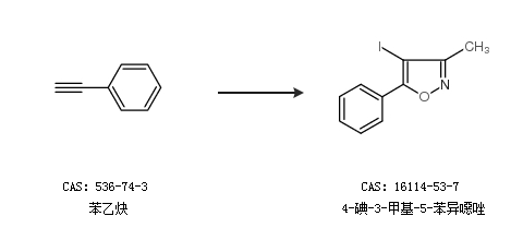 1.通过苯乙炔合成4-碘-3-甲基-5-苯异噁唑