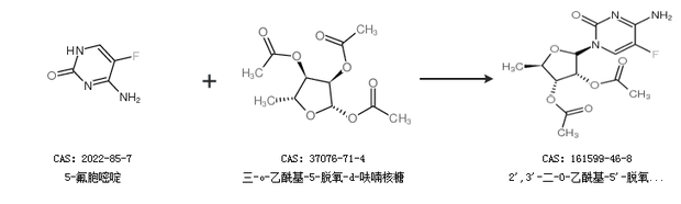 英文别名 5''-Deoxy-2'',3''-di-O-acetyl-5-fluorocytidine;[(2R,3R,4R,5R)-4-acetyloxy-5-(4-amino-5-fluoro-2-oxopyrimidin-1-yl)-2-methyloxolan-3-yl] acetate;2'',3''-di-O-acetyl-5''-deoxy-5-fulurocytidine;2,3-Di-O-Acetyl-5-Deoxy-5-Fuluro-D-Cytidine;