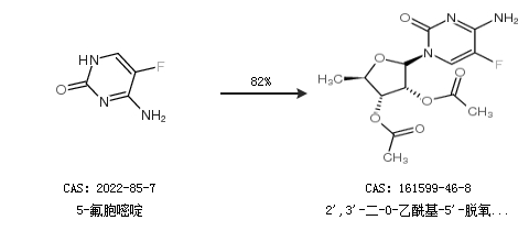 1.通过5-氟胞嘧啶合成2'',3''-二-O-乙酰基-5''-脱氧-5-氟-D-胞啶,收率约82%;