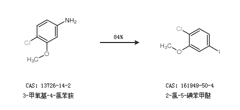 1.通过3-甲氧基-4-氯苯胺合成2-氯-5-碘苯甲醚,收率约84%;