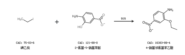 2.通过碘乙烷和2-氨基-5-硝基苯酚合成4-硝基邻氨基苯乙醚,收率约91%;