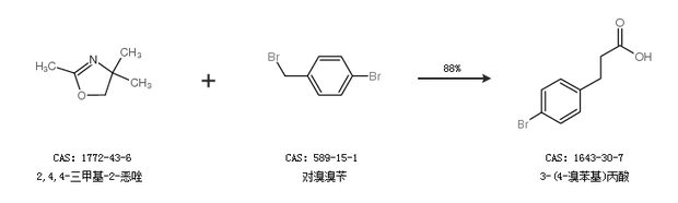 2.通过2,4,4-三甲基-2-恶唑和对溴溴苄合成3-(4-溴苯基)丙酸,收率约88%;