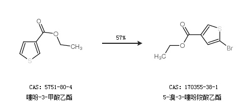 1.通过噻吩-3-甲酸乙酯合成5-溴-3-噻吩羧酸乙酯,收率约57%;