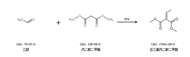1.通过乙醛和丙二酸二甲酯合成亚乙基丙二酸二甲酯,收率约97%;