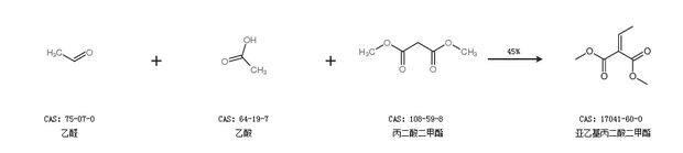 2.通过乙醛、乙酸和丙二酸二甲酯合成亚乙基丙二酸二甲酯,收率约45%;