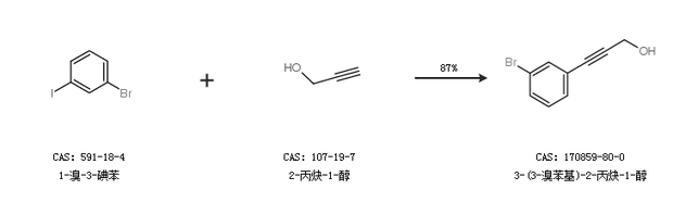 1.通过1-溴-3-碘苯和2-丙炔-1-醇合成3-(3-溴苯基)-2-丙炔-1-醇,收率约87%;