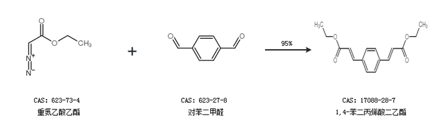 2.通过重氮乙酸乙酯和对苯二甲醛合成1,4-苯二丙烯酸二乙酯,收率约95%;