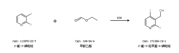 2.通过2-氟-3-碘吡啶和甲酸乙酯合成2-氟-3-羟甲基-4-碘吡啶,收率约63%;