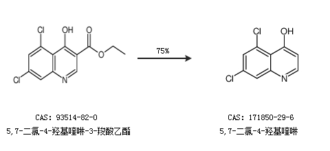 1.通过5,7-二氯-4-羟基喹啉-3-羧酸乙酯合成5,7-二氯-4-羟基喹啉,收率约75%;