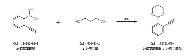 1.通过2-氰基苯硼酸和1,3-丙二醇合成2-氰基苯硼酸 1,3-丙二醇酯,收率约55%;