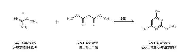 1.通过O-甲基异脲盐酸盐和丙二酸二甲酯合成4,6-二羟基-2-甲氧基嘧啶,收率约99%;