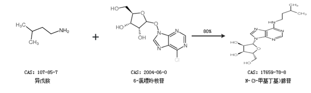 1.通过异戊胺和6-氯嘌呤核苷合成N-(3-甲基丁基)腺苷,收率约80%;