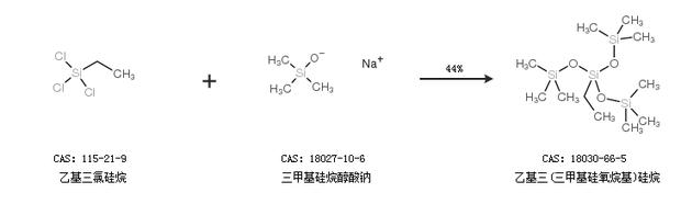 2.通过乙基三氯硅烷和三甲基硅烷醇酸钠合成乙基三(三甲基硅氧烷基)硅烷,收率约44%;