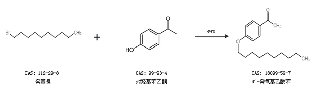 1.通过癸基溴和对羟基苯乙酮合成4''-癸氧基乙酰苯,收率约89%;