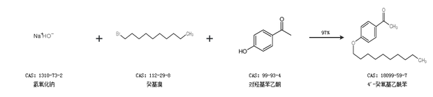 2.通过氢氧化钠、癸基溴和对羟基苯乙酮合成4''-癸氧基乙酰苯,收率约97%;