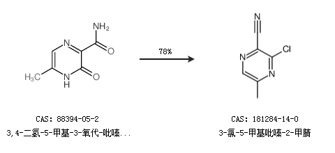 1.通过3,4-二氢-5-甲基-3-氧代-吡嗪羧酰胺(9ci)合成3-氯-5-甲基吡嗪-2-甲腈,收率约78%;