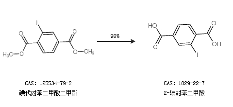 2.通过碘代对苯二甲酸二甲酯合成2-碘对苯二甲酸,收率约96%;