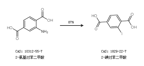 1.通过2-氨基对苯二甲酸合成2-碘对苯二甲酸,收率约87%;