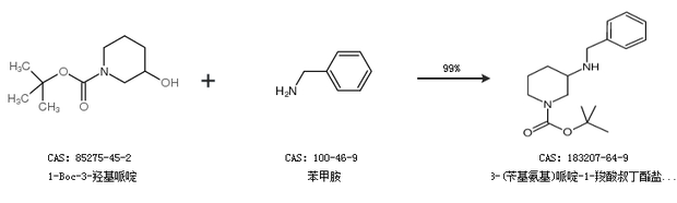 1.通过1-Boc-3-羟基哌啶和苯甲胺合成3-(苄基氨基)哌啶-1-羧酸叔丁酯盐酸盐,收率约99%;