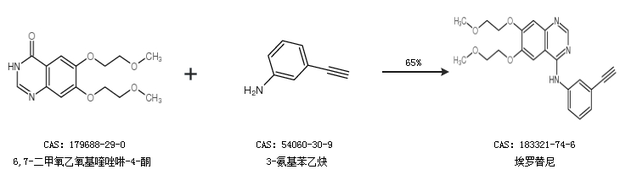 1.通过6,7-二甲氧乙氧基喹唑啉-4-酮和3-氨基苯乙炔合成埃罗替尼,收率约65%;