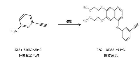 2.通过3-氨基苯乙炔合成埃罗替尼,收率约65%;