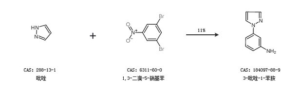 2.通过吡唑和1,3-二溴-5-硝基苯合成3-吡唑-1-苯胺,收率约11%;
