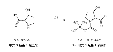 1.通过顺式-3-羟基-L-脯氨酸合成Boc-顺式-3-羟基-L-脯氨酸,收率约10%;