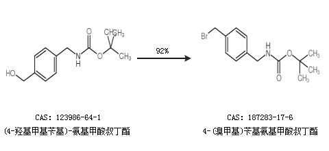1.通过(4-羟基甲基苄基)-氨基甲酸叔丁酯合成4-(溴甲基)苄基氨基甲酸叔丁酯,收率约92%;