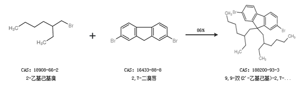 1.通过2-乙基己基溴和2,7-二溴芴合成9,9-双(2''-乙基己基)-2,7-二溴芴,收率约86%;
