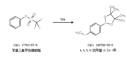 1.通过苯基三氟甲烷磺酸酯合成4,4,5,5-四甲基-2-[4-(甲基硫代)苯基]-1,3,2-二氧硼烷,收率约78%;