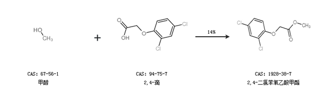 2.通过甲醇和2,4-滴合成2,4-二氯苯氧乙酸甲酯,收率约14%;