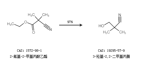 1.通过2-氰基-2-甲基丙酸乙酯合成3-羟基-2,2-二甲基丙腈,收率约97%;