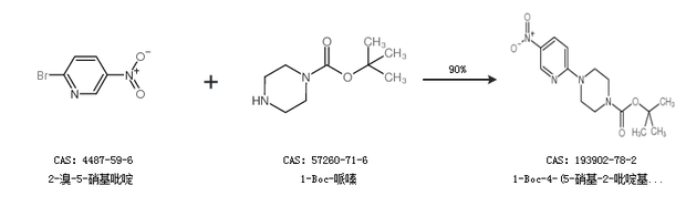 1.通过2-溴-5-硝基吡啶和1-Boc-哌嗪合成1-Boc-4-(5-硝基-2-吡啶基)哌嗪,收率约90%;