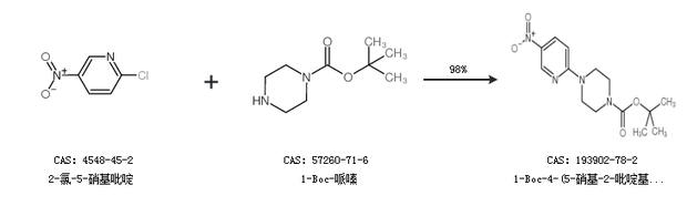 2.通过2-氯-5-硝基吡啶和1-Boc-哌嗪合成1-Boc-4-(5-硝基-2-吡啶基)哌嗪,收率约98%;