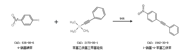 2.通过4-硝基碘苯和苯基乙炔基三甲基硅烷合成1-硝基-4-苯基乙炔苯,收率约94%;