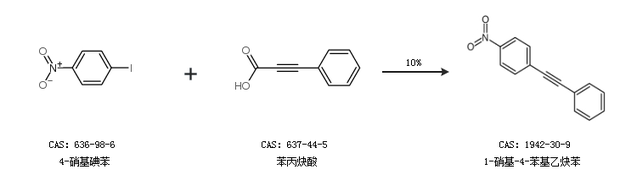 1.通过4-硝基碘苯和苯丙炔酸合成1-硝基-4-苯基乙炔苯,收率约10%;