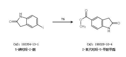 1.通过5-碘吲哚-2-酮合成2-氧代吲哚-5-甲酸甲酯,收率约7%;