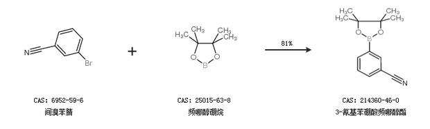2.通过间溴苯腈和频哪醇硼烷合成3-氰基苯硼酸频哪醇酯,收率约81%;